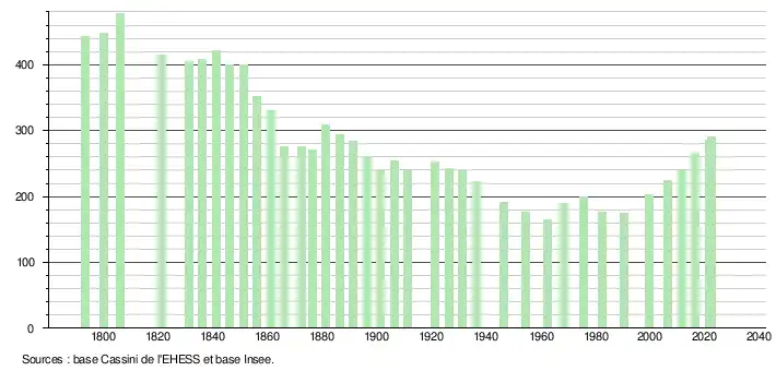 L'évolution du nombre d'habitants est connue à travers les recensements de la population effectués dans la commune depuis 1793. Pour les communes de moins de 10 000 habitants, une enquête de recensement portant sur toute la population est réalisée tous les cinq ans, les populations de référence des années intermédiaires étant quant à elles estimées par interpolation ou extrapolation[21]. Pour la commune, le premier recensement exhaustif entrant dans le cadre du nouveau dispositif a été réalisé en 2006[22].