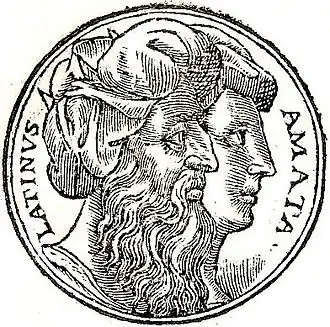 C'est alors qu'Énée aborde en Italie, et vient demander un asile à Latinus. Le roi le reçoit bien, et, se rappelant l'oracle de Faunus, il fait alliance avec Énée, et lui offre sa fille en mariage. Les Latins s'y opposent et forcent leur roi à la guerre. Le Troyen ayant eu l'avantage tue Turnus, devient possesseur de la princesse et héritier de Latinus, dont l'épouse Amata, se pend de rage (ou de désespoir) en voyant les Latins au bord de la défaite.