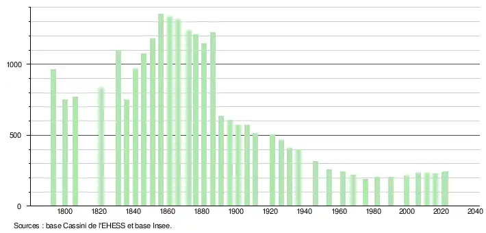 L'évolution du nombre d'habitants est connue à travers les recensements de la population effectués dans la commune depuis 1793. Pour les communes de moins de 10 000 habitants, une enquête de recensement portant sur toute la population est réalisée tous les cinq ans, les populations de référence des années intermédiaires étant quant à elles estimées par interpolation ou extrapolation[30]. Pour la commune, le premier recensement exhaustif entrant dans le cadre du nouveau dispositif a été réalisé en 2006[31].