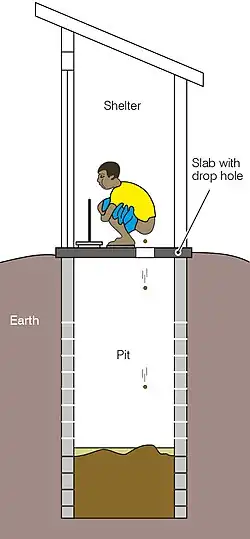La fosse est creusée en général à la pelle et à la pioche, de préférence dans un sol meuble mais pas trop absorbant afin d'éviter les infiltrations. Elle fait couramment un mètre de diamètre (taille suffisante pour pouvoir y creuser sans prendre trop de place), et a une forme circulaire : bien que le creusement soit plus difficile ainsi sans moyens mécaniques, cela rend les parois plus résistantes à l'effondrement[1]. La profondeur de la fosse varie avec la dureté du sol, la proximité de la nappe phréatique et le coût estimé : les profondeurs « standard » lors des programmes publics de construction de latrines sont souvent de 1,5 m si la nappe phréatique est proche, et de 2 à 3 m si le sol le permet ; mais on a déjà rapporté des fosses de plus de 15 m de profondeur, qui ne seront probablement jamais pleines.