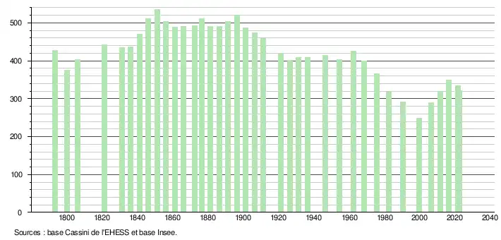 L'évolution du nombre d'habitants est connue à travers les recensements de la population effectués dans la commune depuis 1793. Pour les communes de moins de 10 000 habitants, une enquête de recensement portant sur toute la population est réalisée tous les cinq ans, les populations de référence des années intermédiaires étant quant à elles estimées par interpolation ou extrapolation[20]. Pour la commune, le premier recensement exhaustif entrant dans le cadre du nouveau dispositif a été réalisé en 2006[21].