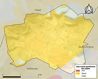 Le retrait-gonflement des sols argileux est susceptible d'engendrer des dommages importants aux bâtiments en cas d’alternance de périodes de sécheresse et de pluie. 88 % de la superficie communale est en aléa moyen ou fort (59,3 % au niveau départemental et 48,5 % au niveau national). Sur les 216 bâtiments dénombrés sur la commune en 2019, 210 sont en aléa moyen ou fort, soit 97 %, à comparer aux 85 % au niveau départemental et 54 % au niveau national. Une cartographie de l'exposition du territoire national au retrait gonflement des sols argileux est disponible sur le site du BRGM[17],[Carte 2].