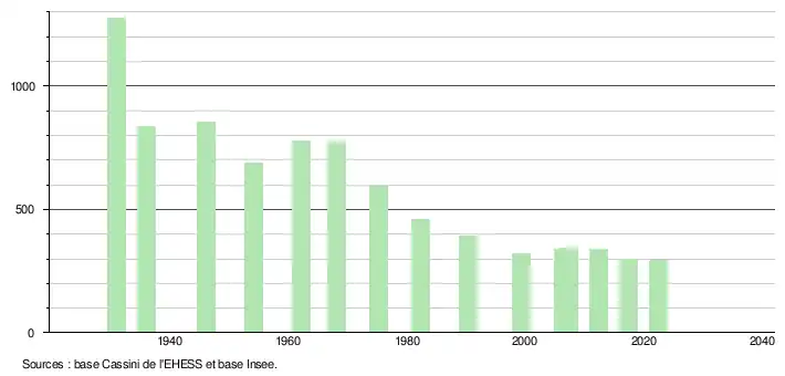L'évolution du nombre d'habitants est connue à travers les recensements de la population effectués dans la commune depuis 1931. Pour les communes de moins de 10 000 habitants, une enquête de recensement portant sur toute la population est réalisée tous les cinq ans, les populations de référence des années intermédiaires étant quant à elles estimées par interpolation ou extrapolation[37]. Pour la commune, le premier recensement exhaustif entrant dans le cadre du nouveau dispositif a été réalisé en 2007[38].