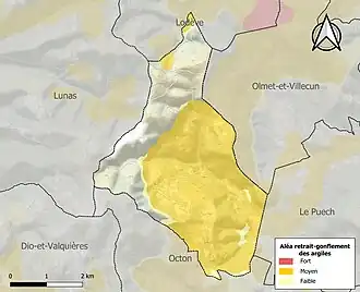 La commune est vulnérable au risque de mouvements de terrains constitué principalement du retrait-gonflement des sols argileux[13]. Cet aléa est susceptible d'engendrer des dommages importants aux bâtiments en cas d’alternance de périodes de sécheresse et de pluie. 63,9 % de la superficie communale est en aléa moyen ou fort (59,3 % au niveau départemental et 48,5 % au niveau national). Sur les 40 bâtiments dénombrés sur la commune en 2019, 40 sont en aléa moyen ou fort, soit 100 %, à comparer aux 85 % au niveau départemental et 54 % au niveau national. Une cartographie de l'exposition du territoire national au retrait gonflement des sols argileux est disponible sur le site du BRGM[14],[Carte 2].