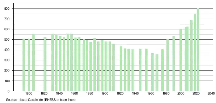 L'évolution du nombre d'habitants est connue à travers les recensements de la population effectués dans la commune depuis 1793. Pour les communes de moins de 10 000 habitants, une enquête de recensement portant sur toute la population est réalisée tous les cinq ans, les populations de référence des années intermédiaires étant quant à elles estimées par interpolation ou extrapolation[28]. Pour la commune, le premier recensement exhaustif entrant dans le cadre du nouveau dispositif a été réalisé en 2008[29].