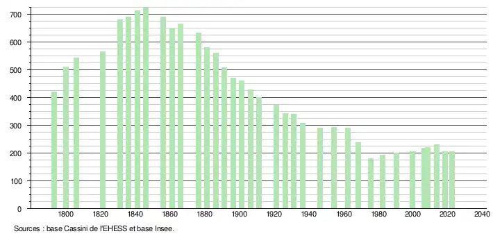 L'évolution du nombre d'habitants est connue à travers les recensements de la population effectués dans la commune depuis 1793. Pour les communes de moins de 10 000 habitants, une enquête de recensement portant sur toute la population est réalisée tous les cinq ans, les populations de référence des années intermédiaires étant quant à elles estimées par interpolation ou extrapolation[32]. Pour la commune, le premier recensement exhaustif entrant dans le cadre du nouveau dispositif a été réalisé en 2008[33].