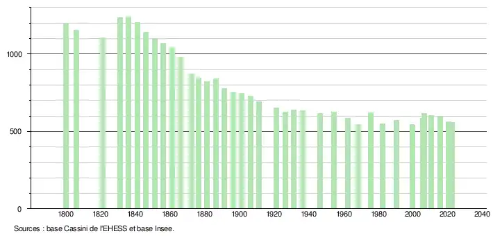 L'évolution du nombre d'habitants est connue à travers les recensements de la population effectués dans la commune depuis 1800. Pour les communes de moins de 10 000 habitants, une enquête de recensement portant sur toute la population est réalisée tous les cinq ans, les populations de référence des années intermédiaires étant quant à elles estimées par interpolation ou extrapolation[21]. Pour la commune, le premier recensement exhaustif entrant dans le cadre du nouveau dispositif a été réalisé en 2005[22].