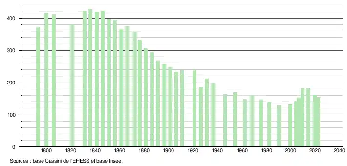 L'évolution du nombre d'habitants est connue à travers les recensements de la population effectués dans la commune depuis 1793. Pour les communes de moins de 10 000 habitants, une enquête de recensement portant sur toute la population est réalisée tous les cinq ans, les populations de référence des années intermédiaires étant quant à elles estimées par interpolation ou extrapolation[37]. Pour la commune, le premier recensement exhaustif entrant dans le cadre du nouveau dispositif a été réalisé en 2004[38].