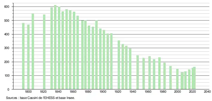 L'évolution du nombre d'habitants est connue à travers les recensements de la population effectués dans la commune depuis 1793. Pour les communes de moins de 10 000 habitants, une enquête de recensement portant sur toute la population est réalisée tous les cinq ans, les populations de référence des années intermédiaires étant quant à elles estimées par interpolation ou extrapolation[14]. Pour la commune, le premier recensement exhaustif entrant dans le cadre du nouveau dispositif a été réalisé en 2005[15].