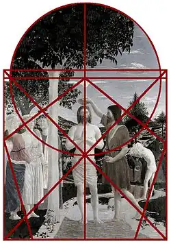 D'emblée, l'on est frappé par l'harmonie, mais aussi, et peut-être même surtout, par la rigueur géométrique qui ordonne et accorde les éléments. Piero della Francesca a construit son œuvre selon des principes harmoniques qui ne sont pas sans évoquer les rapports musicaux que prônait l'architecte Leon Battista Alberti : l'octave, la quinte et la quarte se répondent. Excellent mathématicien, auteur de plusieurs traités de perspective, Piero della Francesca développe une véritable « musique des proportions » dont le corps du Christ est la mesure, et dont de nombreux savants se sont employés à donner les détails[6]. Un exemple permet de comprendre : le torse du Christ est inscrit dans un cercle dont le diamètre équivaut au quart du diamètre des deux grands cercles qui constituent l'ensemble du panneau, (De pictura).