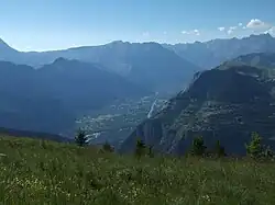 Le Bourg-d'Oisans depuis le Pas de la Confession au nord-est.