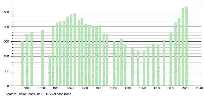 L'évolution du nombre d'habitants est connue à travers les recensements de la population effectués dans la commune depuis 1793. Pour les communes de moins de 10 000 habitants, une enquête de recensement portant sur toute la population est réalisée tous les cinq ans, les populations de référence des années intermédiaires étant quant à elles estimées par interpolation ou extrapolation[13]. Pour la commune, le premier recensement exhaustif entrant dans le cadre du nouveau dispositif a été réalisé en 2006[14].