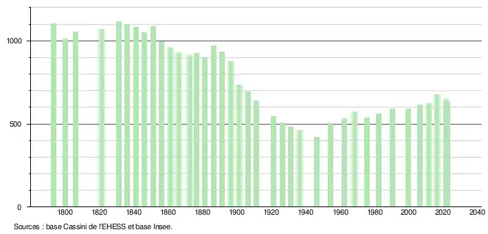 L'évolution du nombre d'habitants est connue à travers les recensements de la population effectués dans la commune depuis 1793. Pour les communes de moins de 10 000 habitants, une enquête de recensement portant sur toute la population est réalisée tous les cinq ans, les populations de référence des années intermédiaires étant quant à elles estimées par interpolation ou extrapolation[17]. Pour la commune, le premier recensement exhaustif entrant dans le cadre du nouveau dispositif a été réalisé en 2006[18].