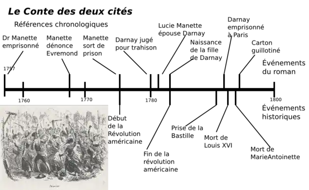 - ↑ La substance du résumé qui suit est en grande partie issue de (en) « A Tale of Two Cities » (consulté le ).