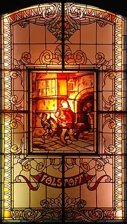 Le mur du fond de cette salle est orné de trois vitraux riches en couleurs représentant John Falstaff.