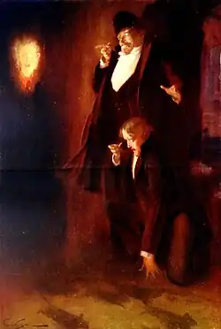 Grimé en masque de la mort rouge à l'occasion d'un bal costumé, Erik le Fantôme descend le grand escalier de l'opéra Garnier. Il y « apparaît avec son véritable visage, défiant les personnages masqués de sa laideur dévoilée[1]. » Aquarelle d'André Castaigne en frontispice de la première édition américaine du roman (1911)[2]. | |