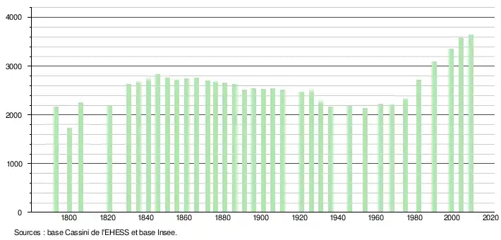 L'évolution du nombre d'habitants est connue à travers les recensements de la population effectués dans la commune depuis 1793. À partir du , les populations légales des communes sont publiées annuellement dans le cadre d'un recensement qui repose désormais sur une collecte d'information annuelle, concernant successivement tous les territoires communaux au cours d'une période de cinq ans. Pour les communes de moins de 10 000 habitants, une enquête de recensement portant sur toute la population est réalisée tous les cinq ans, les populations légales des années intermédiaires étant quant à elles estimées par interpolation ou extrapolation[9]. Pour la commune, le premier recensement exhaustif entrant dans le cadre du nouveau dispositif a été réalisé en 2004[10],[Note 1].
