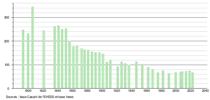 L'évolution du nombre d'habitants est connue à travers les recensements de la population effectués dans la commune depuis 1793. Pour les communes de moins de 10 000 habitants, une enquête de recensement portant sur toute la population est réalisée tous les cinq ans, les populations de référence des années intermédiaires étant quant à elles estimées par interpolation ou extrapolation[24]. Pour la commune, le premier recensement exhaustif entrant dans le cadre du nouveau dispositif a été réalisé en 2008[25].