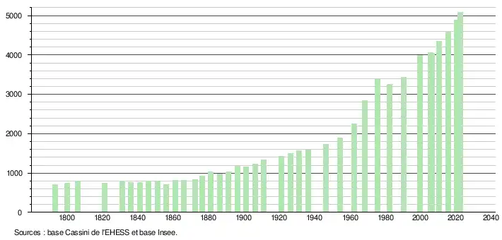 L'évolution du nombre d'habitants est connue à travers les recensements de la population effectués dans la commune depuis 1793. Pour les communes de moins de 10 000 habitants, une enquête de recensement portant sur toute la population est réalisée tous les cinq ans, les populations de référence des années intermédiaires étant quant à elles estimées par interpolation ou extrapolation[29]. Pour la commune, le premier recensement exhaustif entrant dans le cadre du nouveau dispositif a été réalisé en 2005[30].