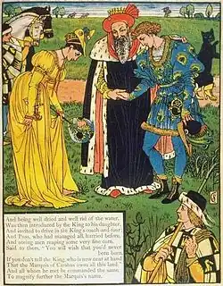 Un jour, sachant que le roi et sa fille voyagent le long de la rivière, le Chat persuade son maître de retirer ses vêtements et d'entrer dans la rivière. Il cache les habits de son maître derrière un rocher, puis appelle à l'aide. Lorsque le roi arrive, le Chat explique que son maître, le « marquis de Carabas » s'est fait dépouiller de ses habits alors qu'il se baignait dans la rivière. Le roi offre de riches vêtements au jeune homme et l'invite à s'asseoir dans son carrosse aux côtés de sa fille qui tombe instantanément amoureuse de lui.