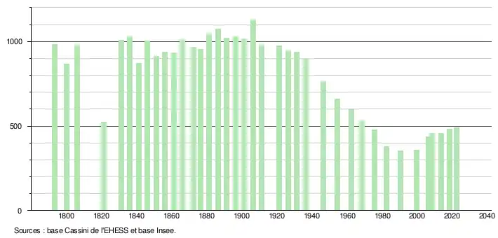 L'évolution du nombre d'habitants est connue à travers les recensements de la population effectués dans la commune depuis 1793. Pour les communes de moins de 10 000 habitants, une enquête de recensement portant sur toute la population est réalisée tous les cinq ans, les populations de référence des années intermédiaires étant quant à elles estimées par interpolation ou extrapolation[29]. Pour la commune, le premier recensement exhaustif entrant dans le cadre du nouveau dispositif a été réalisé en 2008[30].