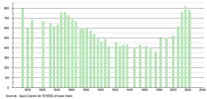 L'évolution du nombre d'habitants est connue à travers les recensements de la population effectués dans la commune depuis 1793. Pour les communes de moins de 10 000 habitants, une enquête de recensement portant sur toute la population est réalisée tous les cinq ans, les populations de référence des années intermédiaires étant quant à elles estimées par interpolation ou extrapolation[33]. Pour la commune, le premier recensement exhaustif entrant dans le cadre du nouveau dispositif a été réalisé en 2006[34].