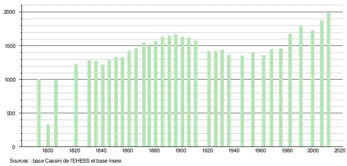 L'évolution du nombre d'habitants est connue à travers les recensements de la population effectués dans la commune depuis 1793. À partir du , les populations légales des communes sont publiées annuellement dans le cadre d'un recensement qui repose désormais sur une collecte d'information annuelle, concernant successivement tous les territoires communaux au cours d'une période de cinq ans. Pour les communes de moins de 10 000 habitants, une enquête de recensement portant sur toute la population est réalisée tous les cinq ans, les populations légales des années intermédiaires étant quant à elles estimées par interpolation ou extrapolation[9]. Pour la commune, le premier recensement exhaustif entrant dans le cadre du nouveau dispositif a été réalisé en 2006[10],[Note 1].