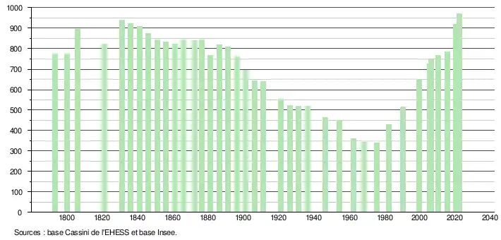 L'évolution du nombre d'habitants est connue à travers les recensements de la population effectués dans la commune depuis 1793. Pour les communes de moins de 10 000 habitants, une enquête de recensement portant sur toute la population est réalisée tous les cinq ans, les populations de référence des années intermédiaires étant quant à elles estimées par interpolation ou extrapolation[21]. Pour la commune, le premier recensement exhaustif entrant dans le cadre du nouveau dispositif a été réalisé en 2005[22].