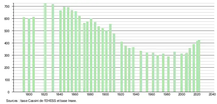 L'évolution du nombre d'habitants est connue à travers les recensements de la population effectués dans la commune depuis 1793. Pour les communes de moins de 10 000 habitants, une enquête de recensement portant sur toute la population est réalisée tous les cinq ans, les populations de référence des années intermédiaires étant quant à elles estimées par interpolation ou extrapolation[35]. Pour la commune, le premier recensement exhaustif entrant dans le cadre du nouveau dispositif a été réalisé en 2005[36].