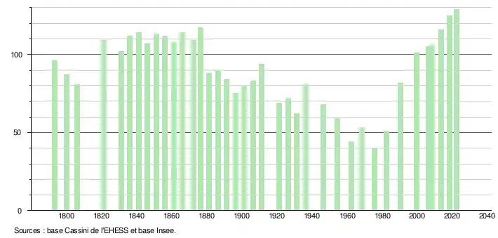 L'évolution du nombre d'habitants est connue à travers les recensements de la population effectués dans la commune depuis 1793. Pour les communes de moins de 10 000 habitants, une enquête de recensement portant sur toute la population est réalisée tous les cinq ans, les populations de référence des années intermédiaires étant quant à elles estimées par interpolation ou extrapolation[24]. Pour la commune, le premier recensement exhaustif entrant dans le cadre du nouveau dispositif a été réalisé en 2008[25].