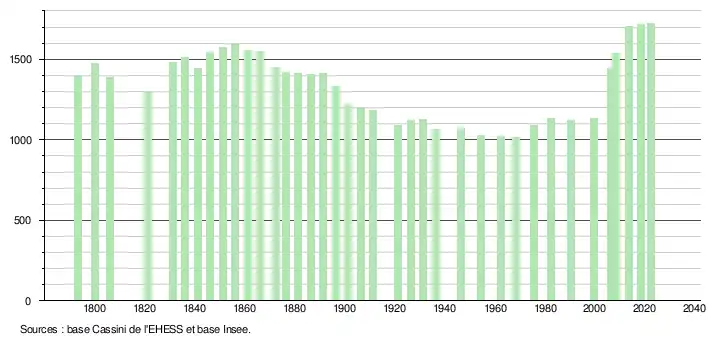 L'évolution du nombre d'habitants est connue à travers les recensements de la population effectués dans la commune depuis 1793. Pour les communes de moins de 10 000 habitants, une enquête de recensement portant sur toute la population est réalisée tous les cinq ans, les populations de référence des années intermédiaires étant quant à elles estimées par interpolation ou extrapolation[32]. Pour la commune, le premier recensement exhaustif entrant dans le cadre du nouveau dispositif a été réalisé en 2008[33].