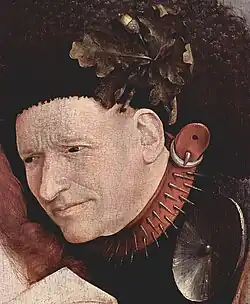 Une alêne est fixée à ce dernier, ce qui a fait dire qu'il s'agissait d'un mercier ambulant exerçant son métier de porte à porte. L'homme transporte sur le dos un panier tel qu'en portaient effectivement les colporteurs comme on en voit chez Pieter Brueghel l'Ancien. Mercier ou non, il s'agit d'un personnage sans point d'attaches — colporteur, pèlerin, vagabond — qui quitte un lieu de péché. L'auberge et le cygne de son enseigne, la cruche vide enfilée sur un bâton signalent un lieu mal famé, un bordel. D'autres éléments peuvent aussi avoir une connotation particulière, soit néfaste, soit érotique, ou au contraire bénéfique : les cruches, le tonneau, les pies, la mésange, le chien, la patte de cochon (celle-ci signale aussi la tente de l’Allégorie des plaisirs), la chouette… L'homme s'éloigne comme un fugitif mais, résolument, il tourne une dernière fois la tête et se défend du chien qui n'a pas l'air menaçant ici (mais le dessin sous-jacent qui transparaît sous la fine couche de couleur prévoyait un animal plus costaud). Ce chien porte au cou un collier hérissé de pointes comme en portaient les chiens de chasse. Ce collier les protégeait des morsures que pouvaient leur infliger les animaux pourchassés. L'un des bourreaux du Couronnement d'épines (Londres) porte un collier semblable.