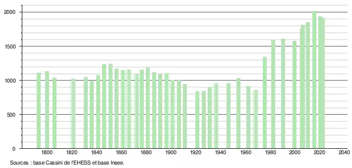 L'évolution du nombre d'habitants est connue à travers les recensements de la population effectués dans la commune depuis 1793. Pour les communes de moins de 10 000 habitants, une enquête de recensement portant sur toute la population est réalisée tous les cinq ans, les populations de référence des années intermédiaires étant quant à elles estimées par interpolation ou extrapolation[31]. Pour la commune, le premier recensement exhaustif entrant dans le cadre du nouveau dispositif a été réalisé en 2005[32].