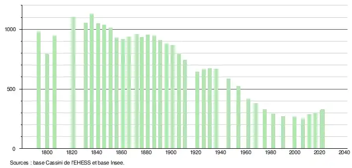 L'évolution du nombre d'habitants est connue à travers les recensements de la population effectués dans la commune depuis 1793. Pour les communes de moins de 10 000 habitants, une enquête de recensement portant sur toute la population est réalisée tous les cinq ans, les populations de référence des années intermédiaires étant quant à elles estimées par interpolation ou extrapolation[24]. Pour la commune, le premier recensement exhaustif entrant dans le cadre du nouveau dispositif a été réalisé en 2006[25].