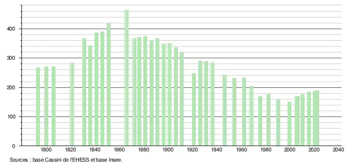 L'évolution du nombre d'habitants est connue à travers les recensements de la population effectués dans la commune depuis 1793. Pour les communes de moins de 10 000 habitants, une enquête de recensement portant sur toute la population est réalisée tous les cinq ans, les populations de référence des années intermédiaires étant quant à elles estimées par interpolation ou extrapolation[17]. Pour la commune, le premier recensement exhaustif entrant dans le cadre du nouveau dispositif a été réalisé en 2005[18].
