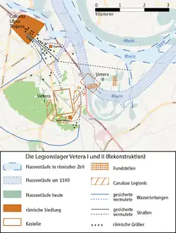 - ↑ Bien que la forteresse de Xanten n’ait pu être excavée en raison d’une modification du cours du Rhin, de nombreux artefacts en provenance des carrières qu’elle gérait ont été retrouvés à Cologne, Dormagen, Neuss, Rindern, Nijmegen et Vecten ainsi que dans la ville civile construite aux abords de la forteresse (Lendering (2002) para 11)