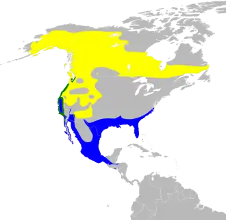 Aux États-Unis, cette paruline niche du centre de l'Alaska jusqu'en Californie. Au Canada, on la retrouve du Yukon au Labrador. La Paruline verdâtre hiverne du sud des États-Unis jusqu'au sud du Guatemala.