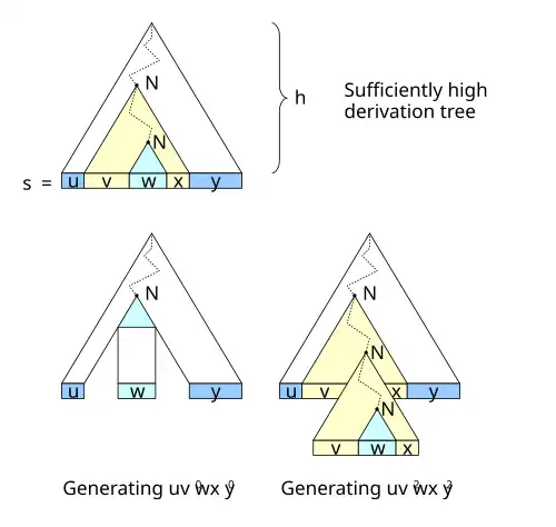 La technique consiste à choisir un mot w appartenant au langage, et à choisir les puissances des symboles de l'alphabet comme étant égale à N. En effet, comme |vxy| < N, il devient alors impossible pour x et y de contenir les trois symboles dont la puissance peut varier. (Un langage algébrique, de manière générale, est un langage ou il n'existe que des dépendances maximum deux à deux entre les puissances de symboles).