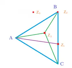 Chaque triangle Tn peut être divisé en quatre petits triangles, comme indiqués sur la figure ci-à droite, selon les milieux de ses côtés. Et Tn+1 est l'un de ces quatre triangles. La construction et le théorème de Thalès garantiront: