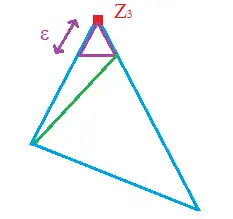 - Le point est sur le sommet : le triangle peut se découper en trois triangles, dont un qui peut être aussi petit que voulu, par continuité de la fonction (elle est bornée) sur le contour de ce petit triangle (qui est aussi petit que voulu donc son périmètre aussi), l'intégrale est aussi petite que voulu ;