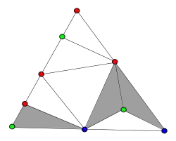 On se donne un triangle ABC, et une triangulation T de ce triangle. L'ensemble S des sommets de T est coloré avec 3 couleurs, de telle sorte que