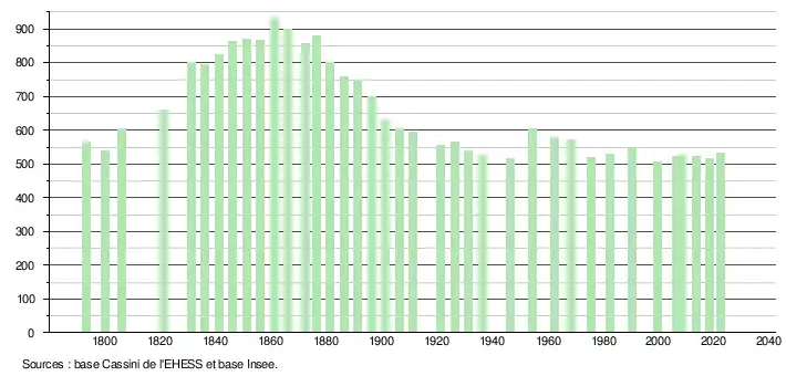 L'évolution du nombre d'habitants est connue à travers les recensements de la population effectués dans la commune depuis 1793. Pour les communes de moins de 10 000 habitants, une enquête de recensement portant sur toute la population est réalisée tous les cinq ans, les populations de référence des années intermédiaires étant quant à elles estimées par interpolation ou extrapolation[17]. Pour la commune, le premier recensement exhaustif entrant dans le cadre du nouveau dispositif a été réalisé en 2008[18].