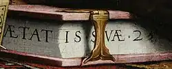 Sur cette étagère supérieure, on trouve, disposés sur un tapis anatolien (qui n'est pas sans rappeler celui qui couvre la table du portrait du Marchand Georg Gisze, peint par Holbein l'année précédente)[27], des objets renvoyant à l'astronomie et la mesure du temps : un globe céleste, trois horloges solaires, deux quadrants, un torquetum. Georges de Selve pose son coude sur un livre dont la tranche comporte la mention : ÆTATIS SVÆ 25, en référence à son âge en ce printemps 1533 ; il lui reste sept ans à vivre.