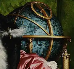 De même que les deux ambassadeurs, de robe courte et de robe longue, représentent le pouvoir temporel et le pouvoir spirituel, de même, les deux étagères présentent la terre et le ciel, avec le globe terrestre en bas et le globe céleste en haut[42], dans un étroit réseau de correspondances.