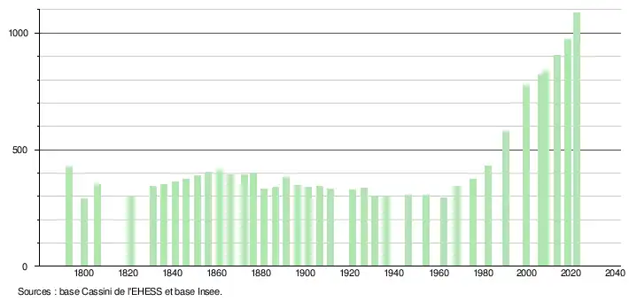 L'évolution du nombre d'habitants est connue à travers les recensements de la population effectués dans la commune depuis 1793. Pour les communes de moins de 10 000 habitants, une enquête de recensement portant sur toute la population est réalisée tous les cinq ans, les populations de référence des années intermédiaires étant quant à elles estimées par interpolation ou extrapolation[20]. Pour la commune, le premier recensement exhaustif entrant dans le cadre du nouveau dispositif a été réalisé en 2008[21].