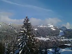 Les Carroz d'Arâches vus depuis les chalets de Doran de l'autre côté de la cluse de l'Arve au sud-ouest. | |||