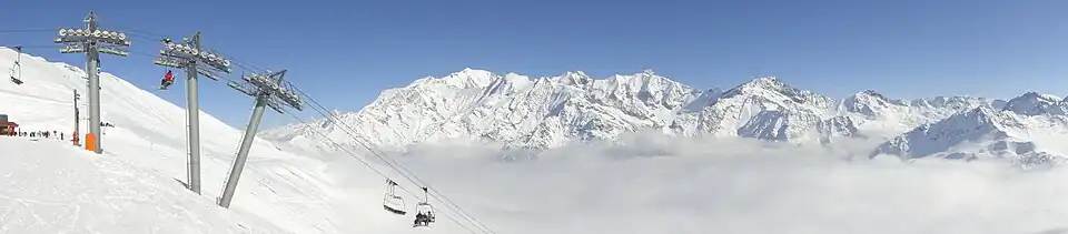 - à l'ouest, la station de sports d'hiver des Contamines s'étend sur les flancs du mont Joly (2 525 m) et permet de rejoindre le domaine skiable de Hauteluce Val Joly par le col du Joly. Le sommet des pistes, situé sur les pentes de l'aiguille Croche, offre un panorama sur le massif du Mont-Blanc, la chaîne des Aravis et la vallée du Beaufortain ;