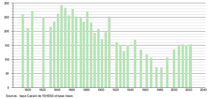 - ↑ Population municipale de référence en vigueur au 1er janvier 2025, millésimée 2022, définie dans les limites territoriales en vigueur au 1er janvier 2024, date de référence statistique : 1er janvier 2022.