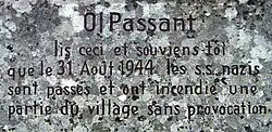 Lors de la fuite des troupes allemandes en 1944 devant l'avancée des Alliés, les SS ont allumé des incendies provoquant de gros dégâts sur les maisons du centre du village. Une stèle a depuis été apposée sur le parapet du grand pont à la mémoire de cet événement. Elle porte l'inscription "Ô passant, lis ceci et souviens-toi que le , les SS nazis sont passés et ont incendié une partie du village sans provocation."