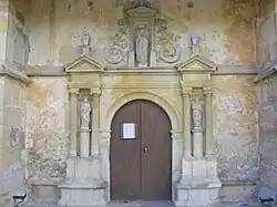- Au nord, sur le village, le flanc de la vieille église s’ouvre par un petit portail. Il est de style ionique et s’orne de trois niches en conques du XVIe siècle. Elles ont été vidées de leurs statues pendant la Révolution. Ce n’est qu’avant la Seconde Guerre mondiale que l’abbé Camille-Paul Joignon, « aidé et encouragé par les meilleures familles du lieu », y replace, dans la partie supérieure, la statue du Christ bénissant, dans un geste d’accueil, les fidèles qui entrent dans l'église. À droite et à gauche, en contrebas, les statues de saint Pierre et de saint Paul, assistant le Sauveur dans son geste de bienvenue.